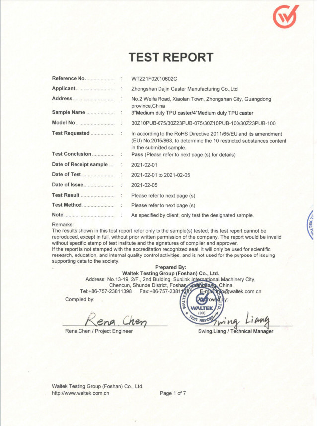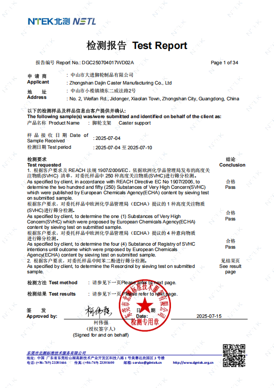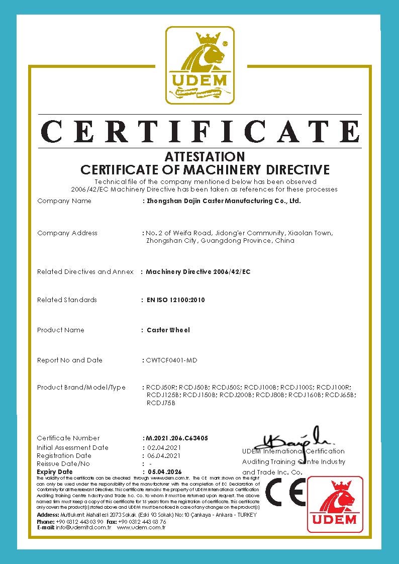 At Zhongshan Dajin Caster Co., Ltd., we prioritize excellence in every product we manufacture. Our operations are guided by a stringent quality management system aligned with ISO 9001:2015 standards, ensuring consistent performance and reliability. We are committed to environmental responsibility, with our products adhering to RoHS and REACH directives, reflecting our dedication to sustainable practices. Additionally, our offerings meet CE certification requirements, affirming their compliance with European safety and environmental regulations. To uphold these standards, we employ comprehensive quality control measures, including tests for walking performance, salt spray resistance, brake fatigue, load capacity, brake efficiency, and impact resilience. These rigorous evaluations guarantee that our caster and wheel products deliver dependable performance across various applications.