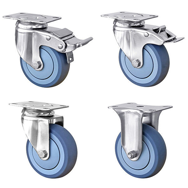 Designed for medium-duty mobility, these stainless steel 304 casters feature blue thermoplastic rubber (TPR) wheels, combining shock absorption with floor protection. The single ball bearing ensures smooth rolling at an economical price, while the stainless steel frame resists rust and corrosion in demanding environments. Available in 75mm, 100mm, and 125mm diameters, these casters support 100-150kg loads with optimized rotational radius (70-110mm) for tight-space maneuverability. The 65×94mm plate offers dual hole spacing (45×78mm / 45×71mm) for flexible mounting.