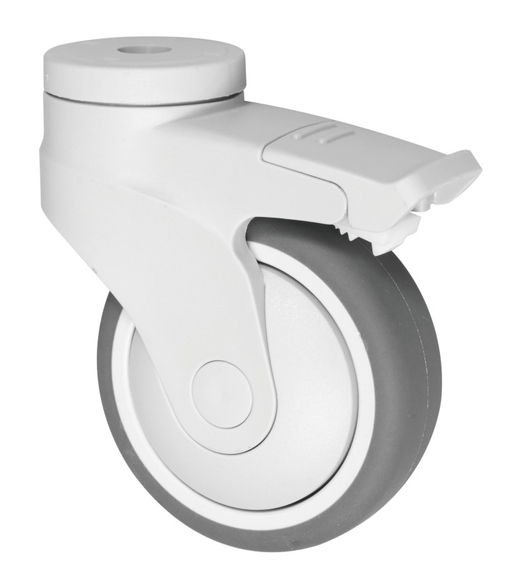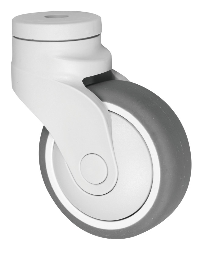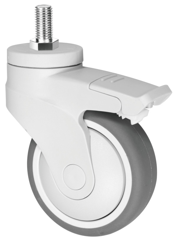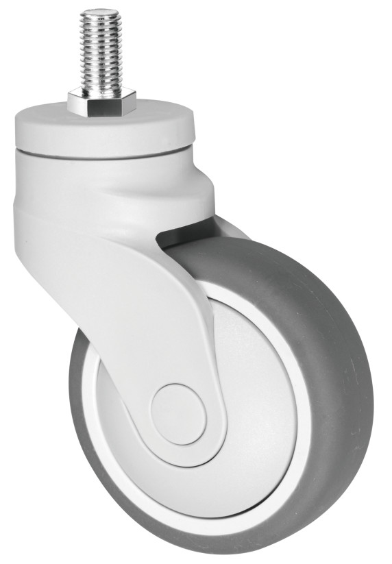 These elastic thermoplastic rubber (TPR) all-plastic casters combine a shock-absorbing TPR tread with a polypropylene core for quiet, corrosion-resistant mobility, featuring single ball bearings for smooth rolling, supporting 75-100kg loads with non-marking floor protection in -35°C to +90°C environments. Plastic frame for water resistance.