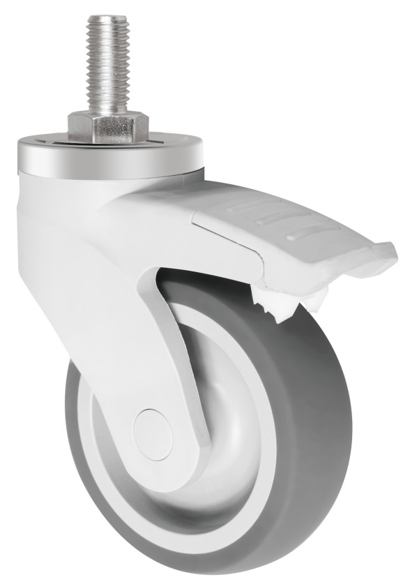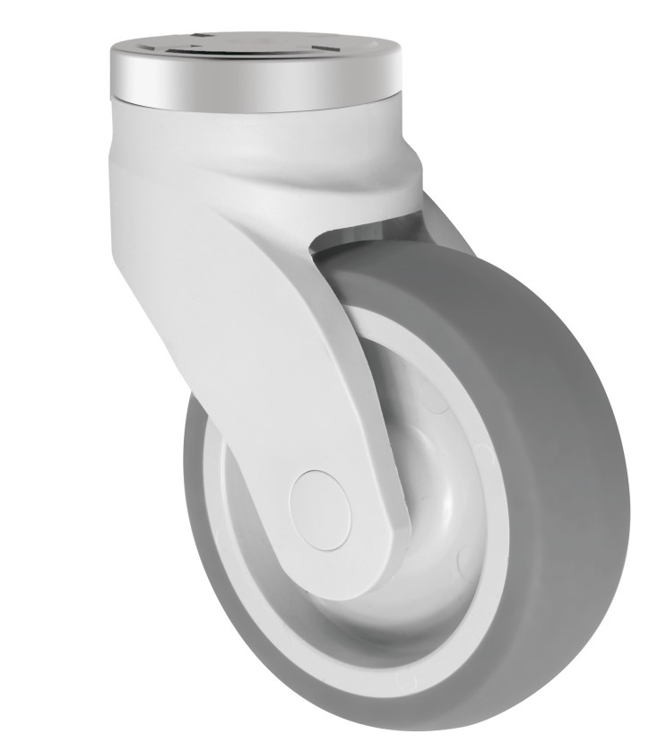 These medium-duty TPR casters feature an elastic TPR tread for shock absorption and quiet rolling, paired with a polypropylene (PP) core for durability, 100kg load capacity, making them ideal for medical, food service, and light industrial applications in temperatures from -35°C to +90°C.