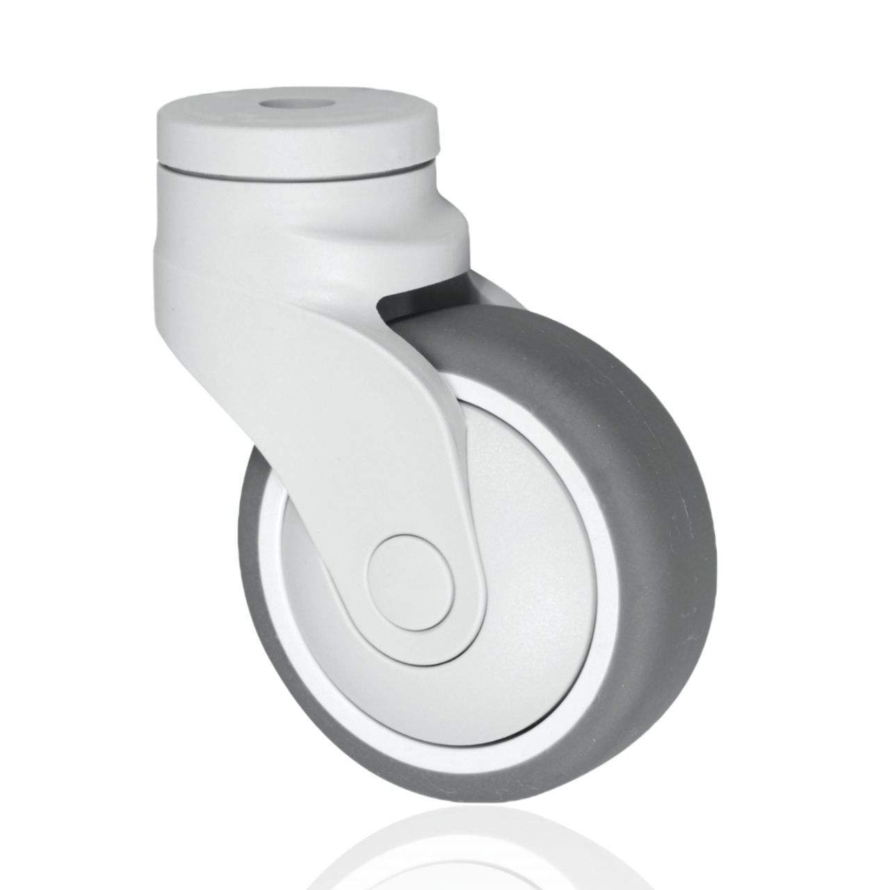 This 4 inch (100 mm) bolt hole swivel Medical caster with total lock brake is specially manufactured for medical and hospital applications, providing silent, smooth, and safe mobility for hospital beds, medical trolleys, and equipment. Featuring a soft grey TPR (thermoplastic rubber) tread on a durable PP (polypropylene) core, it ensures excellent floor protection, low noise, shock absorption, and non-marking performance in sensitive healthcare environments. The total lock brake simultaneously locks both swivel and wheel for maximum stability.