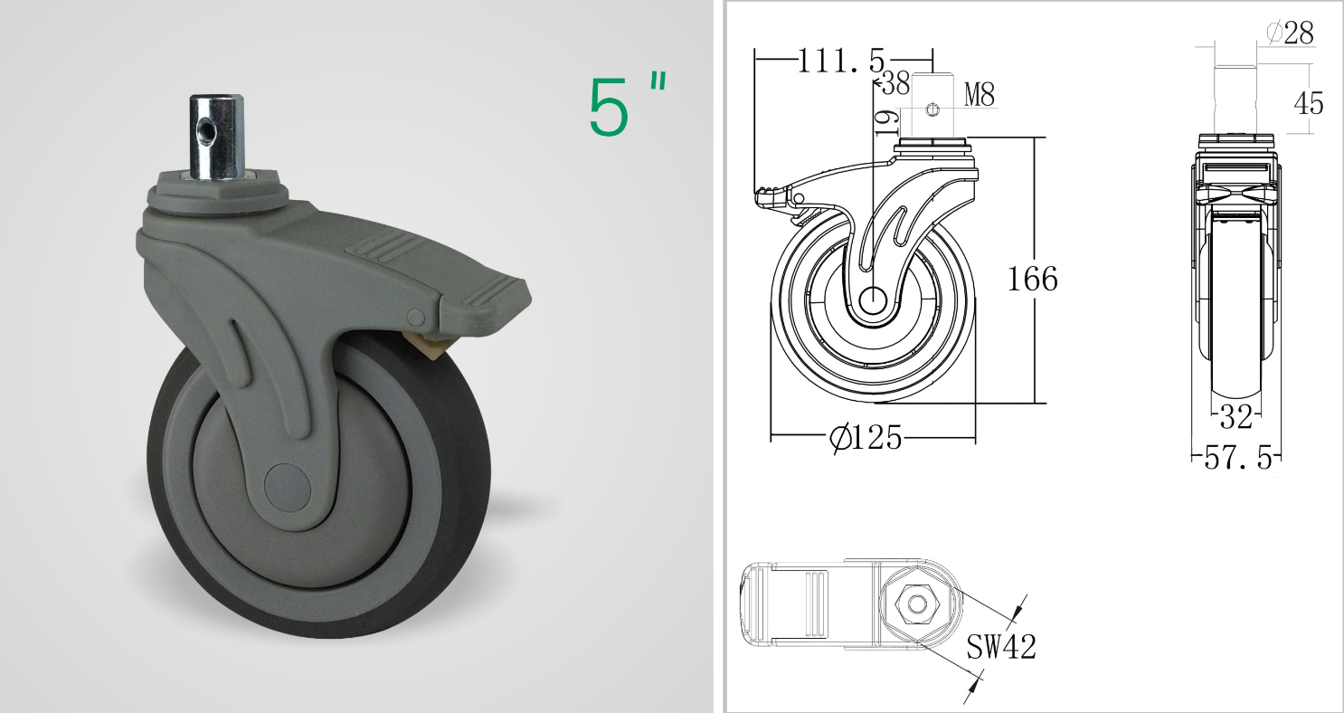 This medical caster wheel is designed to provide smooth, quiet, and hygienic mobility for hospital equipment. The TPR wheel reduces vibration and noise, while the nylon bracket ensures corrosion resistance and lightweight handling, making it suitable for healthcare facilities where stability and cleanliness are essential.